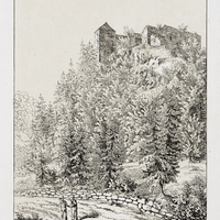 Vue du château de Môtiers délabré au pied duquel passent deux bûcherons.